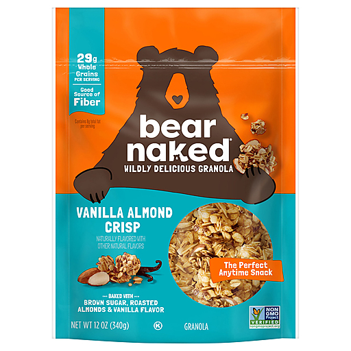 Every bag of granola starts with us foraging for irresistible flavors and bountiful chunks of goodness. Bear Naked Vanilla Almond Crisp granola is soft-baked and blended with whole grain oats, brown sugar, roasted almonds, and sweet vanilla flavor. After you try it, you'll keep coming back for more handfuls. Top your morning yogurt, fruit, or smoothie with Bear Naked Granola. Non-GMO Project Verified, each serving contains 28g of whole grains; Pack in the flavor with each crunchy bite. Take this bag with you to the office, on a hike, or take along on road trips for easy resealable snacks. Trust us, the bears know how to sniff out wildly delicious flavors, and this granola is the perfect blend of crunchy almonds, warm vanilla flavor, and soft-rolled oats. So next time your stomach growls, grab a pawful of Bear Naked granola!