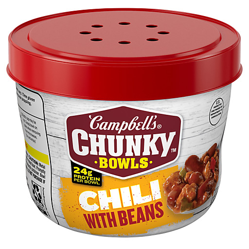 Tackle your hunger with Campbell’s® Chunky® Chili With Beans. This convenient microwave chili is packed with kidney beans, seasoned beef and pork crumble, and red and green peppers for a comforting taste that’s just like mom used to make. With 24g of protein in each single-serve bowl, it’s a satisfying chili that fuels even the heartiest of appetites. Campbell’s® Chunky® Chili is a year-round pantry staple and the MVP of game day snacks, delivering a winning combination of flavor and convenience. Enjoy a warm bowl of this microwave chili when watching the game from home, or eat it on-the-go as a convenient snack at your next tailgating event. To prepare, simply heat in the microwave for 1.5 minutes. Whether you’re a football fan or simply craving something hearty, Campbell’s® Chunky® Chili With Beans will keep you feeling full and satisfied from kickoff to the final whistle. Make every game day a winner with Campbell's Chunky®.