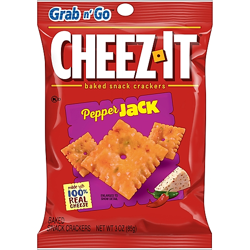 Make snack time more fun with Cheez-It Pepper Jack Baked Snack Crackers. Cheez-It Baked Snack Crackers are the real deal - made with 100% real cheese that's been carefully aged for an irresistible taste. Each perfect square is loaded with spicy, cheesy flavor that hits your taste buds with every delicious mouthful. A baked snack, Cheez-It crackers are perfect for game time, party spreads, school lunches, BBQs, after-school snacks, snacks at the office, late-night snacking and more - the cheesy options are endless. Ideal for on the go too, Cheez-It crackers are great to bring along on field trips, camping, hiking, trips to the park, picnics, outdoor concerts, everyday errands, and more. The antidote to flavorless crackers, Cheez-It crackers are packed with irresistible cheesy flavor and are a great addition to homemade snack mixes and party mixes. You'll love the one-of-a-kind flavor of real cheese in every tasty handful of Cheez-It Pepper Jack Baked Snack Crackers.